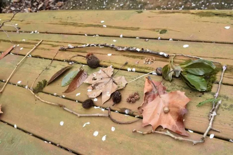 주변의 나뭇가지, 낙엽, 도토리, 마른 열매등이 옹기종기 모여서 사람들이 손이 닿는대로 올려두었는데도 정말 예쁜 작품이 완성되었습니다. 이 안에 사계절이 모두 들어있는 것 같아요. 자연이 만들어내는 색상은 항상 마음을 편안하게 해주는 마법이 있습니다.