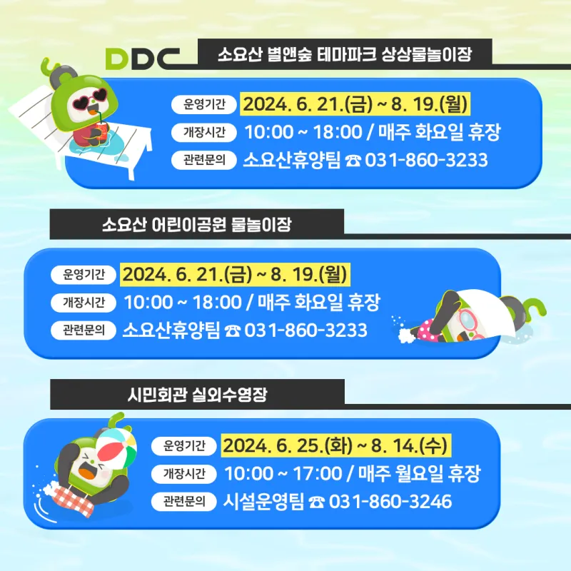 ○ 운영기간 : 2024. 6. 21.(금) ~ 8. 19.(월) ○ 개장시간 : 10:00 ~ 18:00 (매주 화요일 휴장) ○ 이용료 : 누구나 무료 ○ 문의 : 소요산휴양팀 ☎ 031-860-3233 |