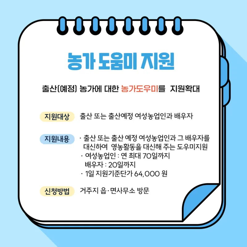 - 1일 지원기준단가 80,000원의 80%인 64,000원이며 출산(예정)여성농업인은 연 최대 70일까지,