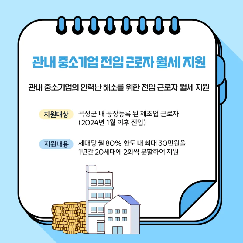 - 관내 중소기업에 종사하고 있는 관외 근로자가 곡성군으로 전입할 경우 월세를 지원하여 고용 안정을 도모하는 사업입니다.