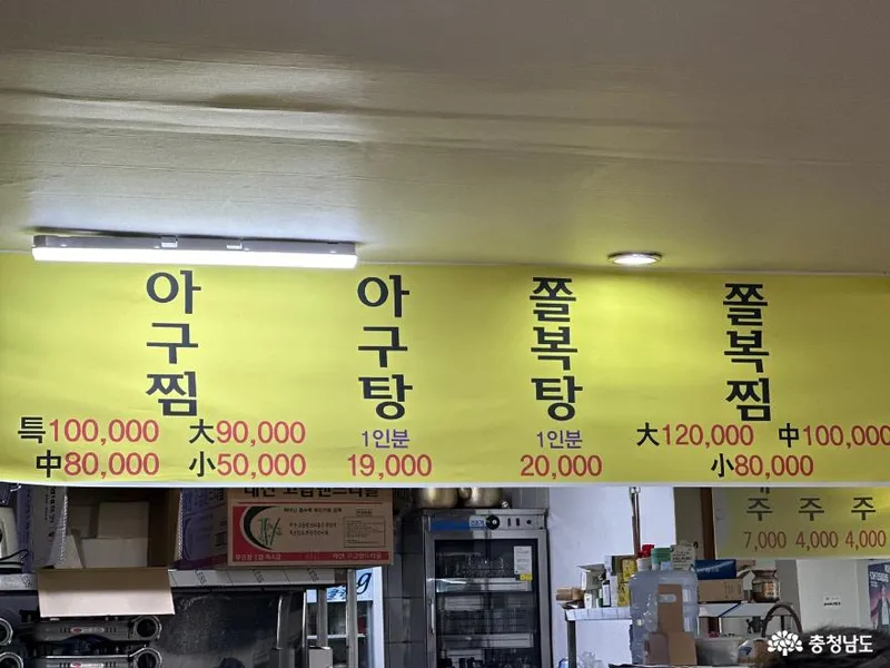 메뉴는 아구찜 특 100,000원, 대 90,000원, 중 80,000원, 소 50,000원 / 아구탕 1인분 19,000원 / 쫄복탕 1인분 20,000원 / 쫄복찜 대 120,000원, 중 100,000원, 소 80,000원으로 나누어지니 입맛에 따라 주문해서드시면 되지만 보통 쫄복탕과 아구찜을 많이 드시더라구요.