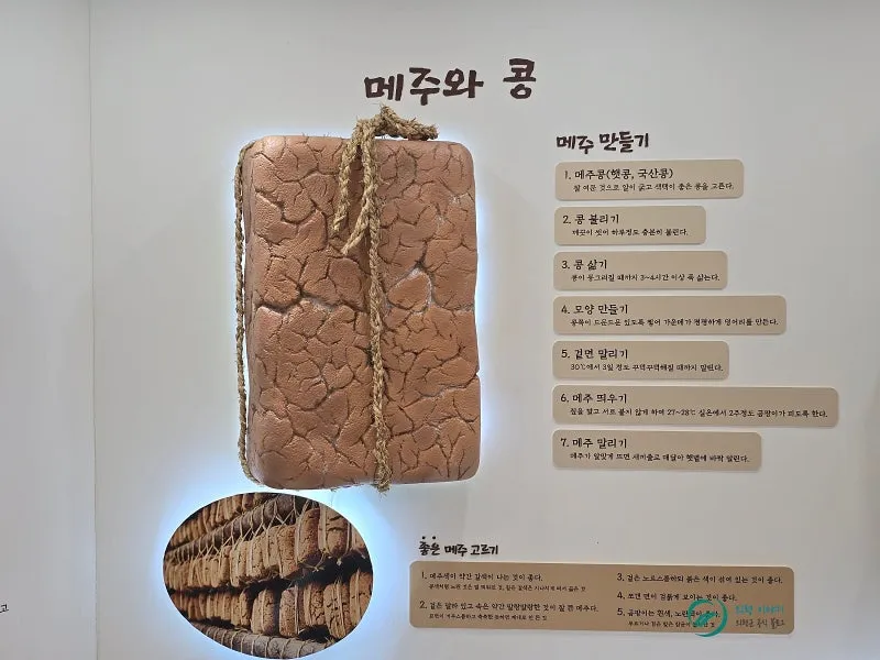 메주콩을 고르고 콩불리기, 콩삶기, 모양만들기, 겉면 만들기, 메주 띄우기, 메주 말리기로 이어지는 메주만들기에 대한 설명도 볼 수 있어요.
