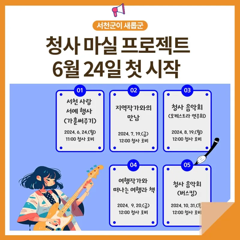 구체적 일정으로는 ▲24일 서예 퍼포먼스 및 가훈써주기 ▲7월 19일 지역작가와의 만남 ▲8월 19일 오케스트라 연주회 ▲9월 20일 유명 여행 작가와 떠나는 여행과 책 ▲10월 31일 버스킹 공연 등이 진행됩니다.