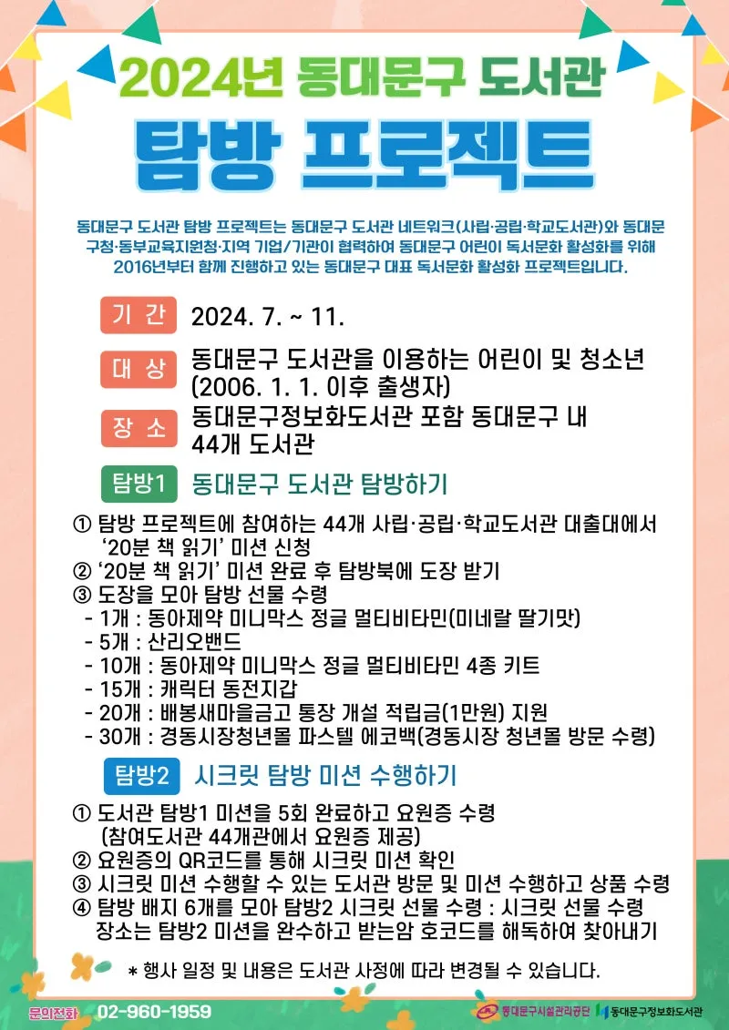 어린이 독서문화 활성화를 위한 <2024 동대문구 도서관 탐방 프로젝트> 참여 안내