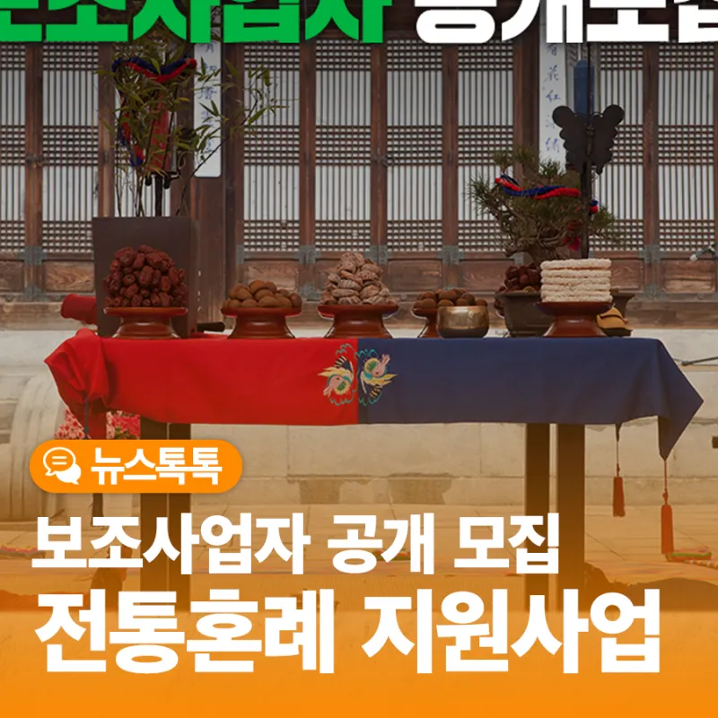 - 민족 고유의 혼인 예식인 전통혼례를 지원·장려하고 계승·발전시키고자 전통혼례 지원사업을 추진할 보조사업자 모집