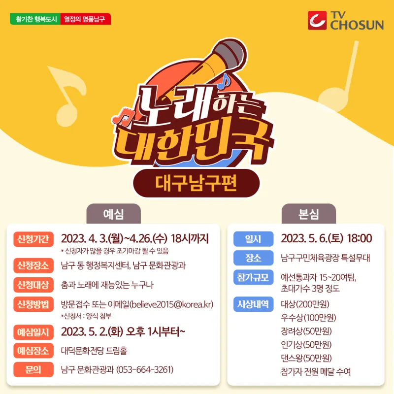 [노래하는 대한민국] 대구 남구 편 예심 참가 신청 안내