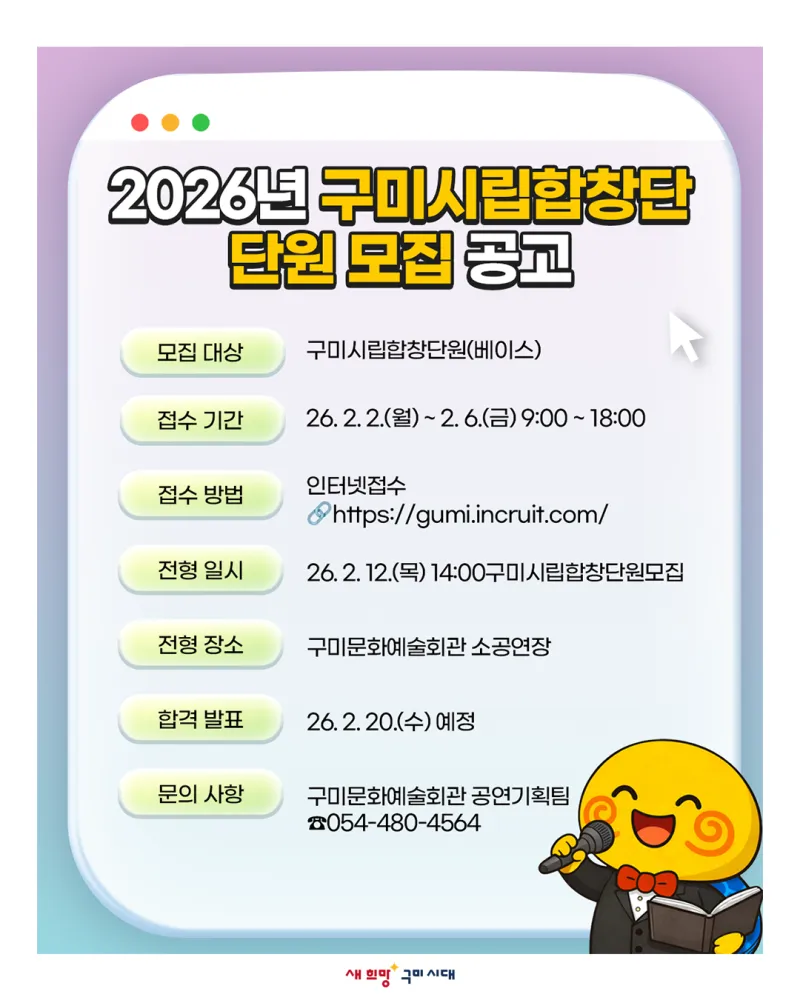 • 전형일시 : 26. 2. 12.(목) 14:00구미시립합창단원모집