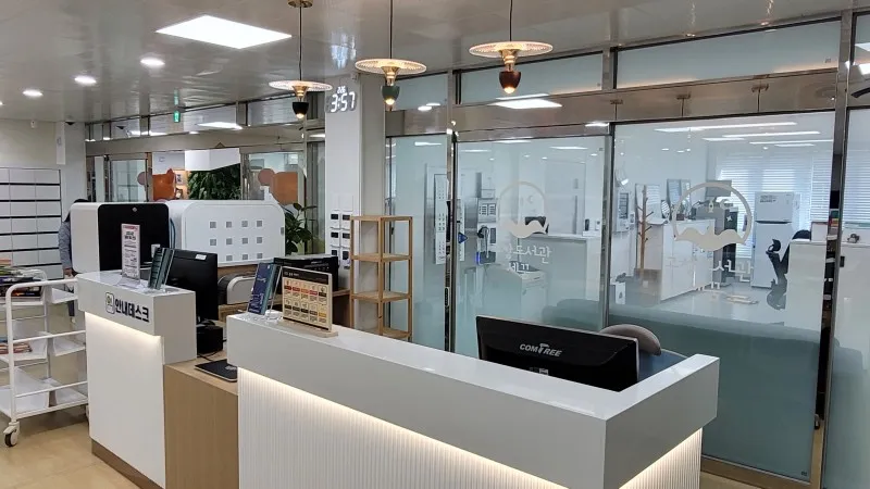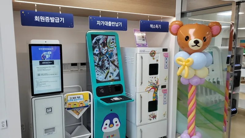 회원증 발급기, 자가 대출 반납기, 책 소독기가 설치되어 있습니다.