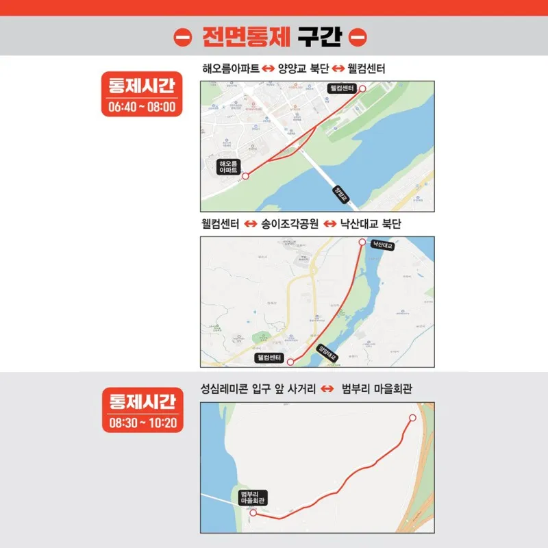 · 전면통제(06:40~08:00) : 해오름아파트 ↔ 양양교 ↔ 웰컴센터 ↔ 양양대교 ↔ 낙산대교