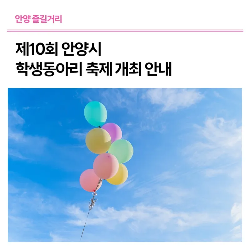 🎉 안양시 만안청소년수련관 주관으로 제10회 안양시 학생동아리 축제가 아래와 같이 개최되오니 청소년 및 시민들의 많은 관심과 참여 부탁드립니다! |