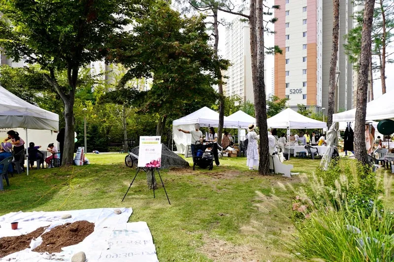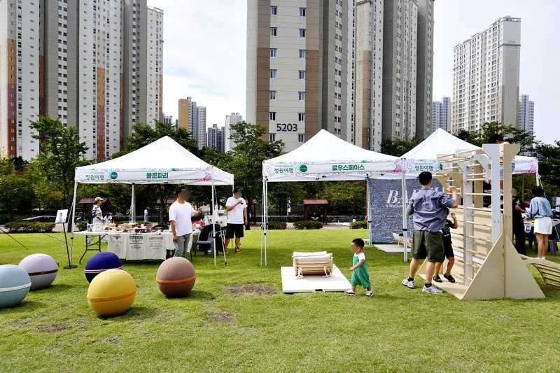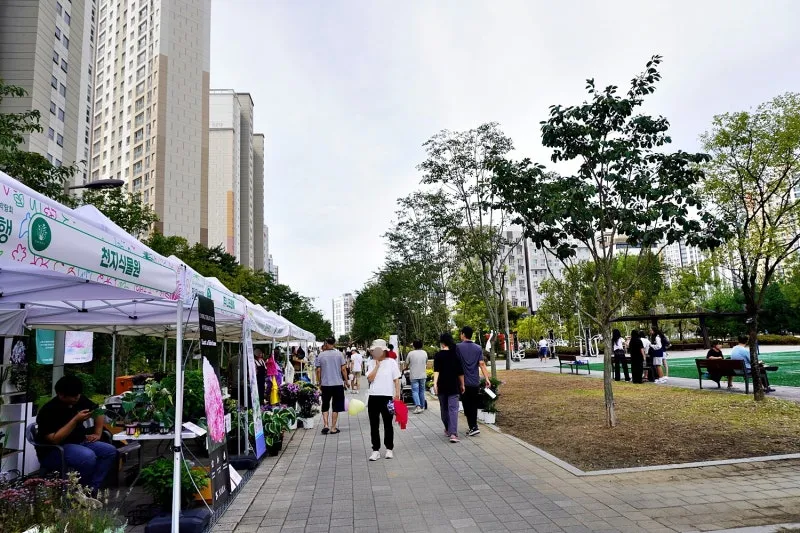 아파트 단지와 공원 사이 산책로를 따라 수십 개의 부스가 들어섰습니다.