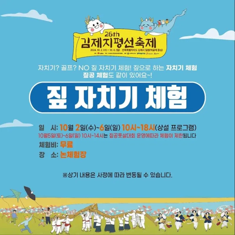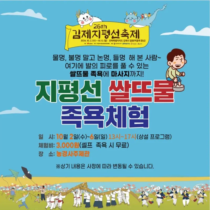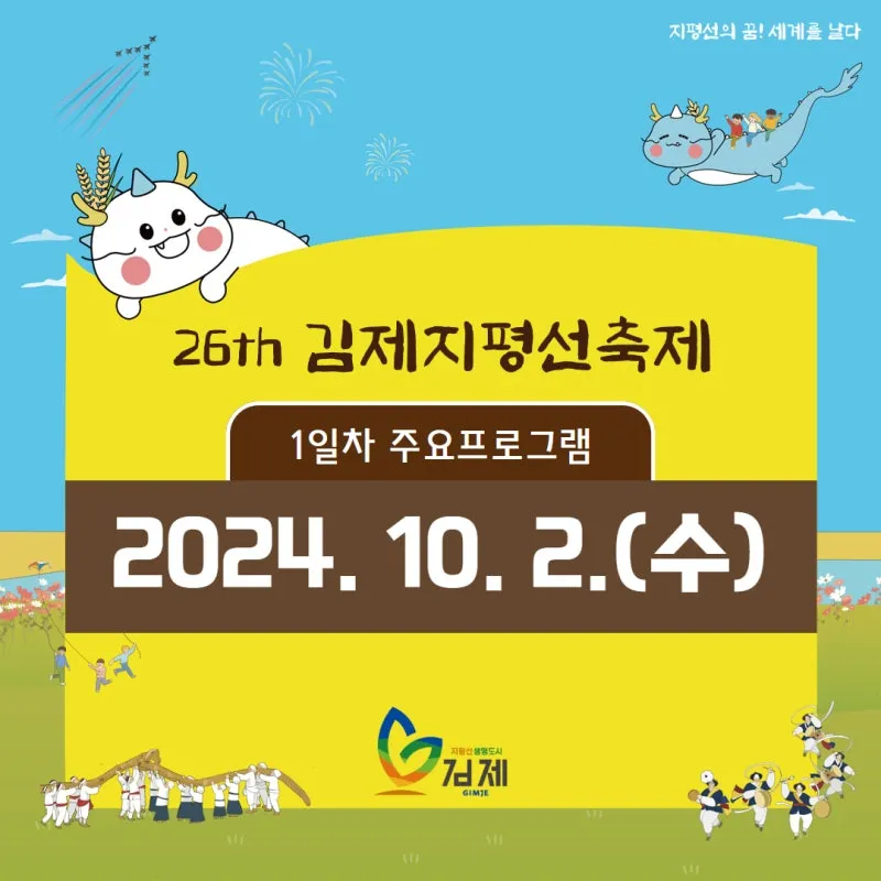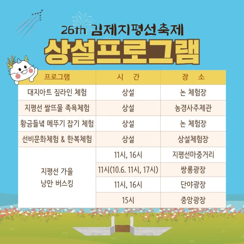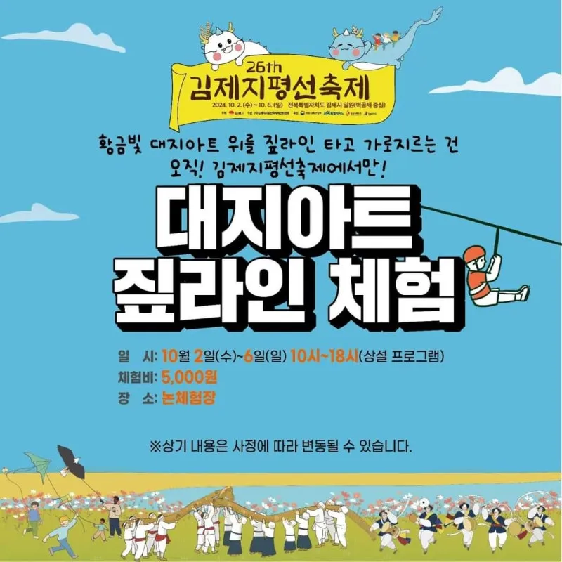 김제지평선축제를 알리는 개막식부터~ 대지아트 짚라인 체험, 지평선 쌀뜨물 족욕체험, 짚 차기기 체험 등 어떤 프로그램이 준비 되어 있는지 일정표📅 확인하시고, 함께 축제를 즐겨봐요~!