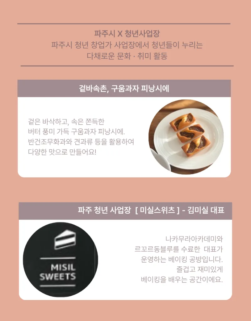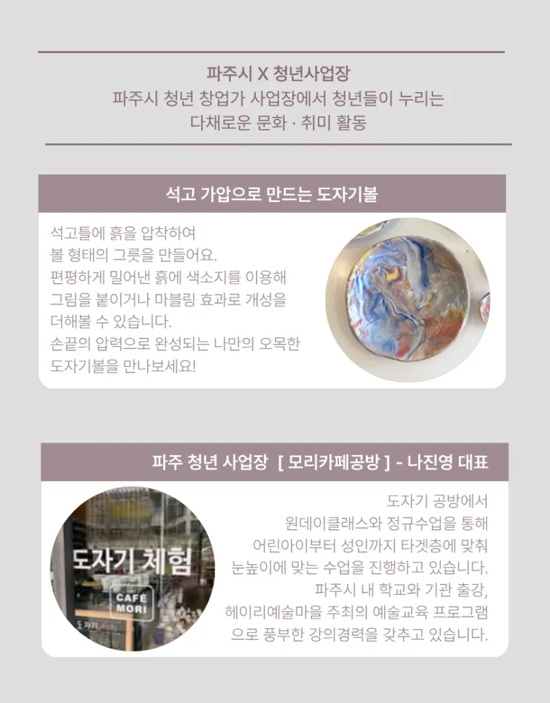 파주 청년사업장 12곳이 협업하여 지역 청년들의 생활권 내에서 문화, 취미 활동을 할 수 있도록 지원하는 사업입니다.