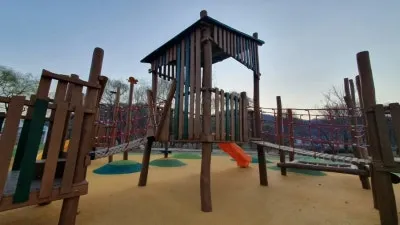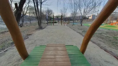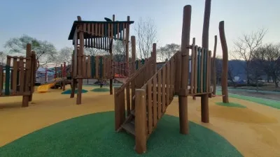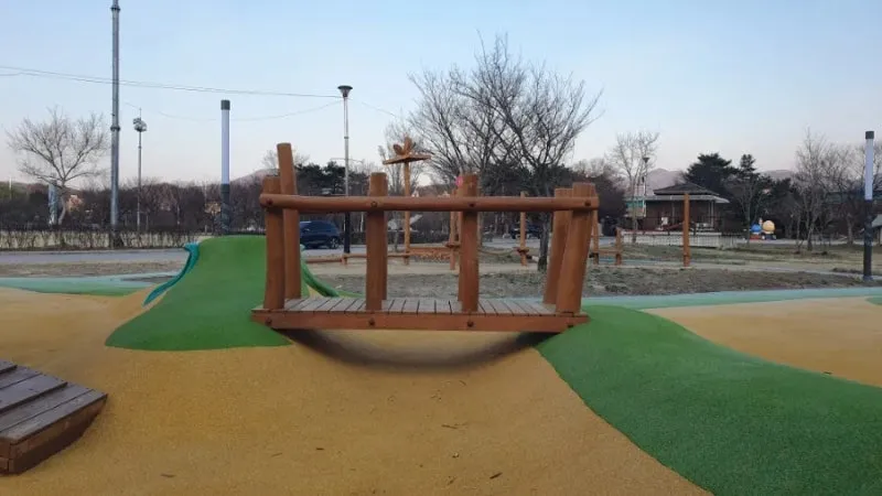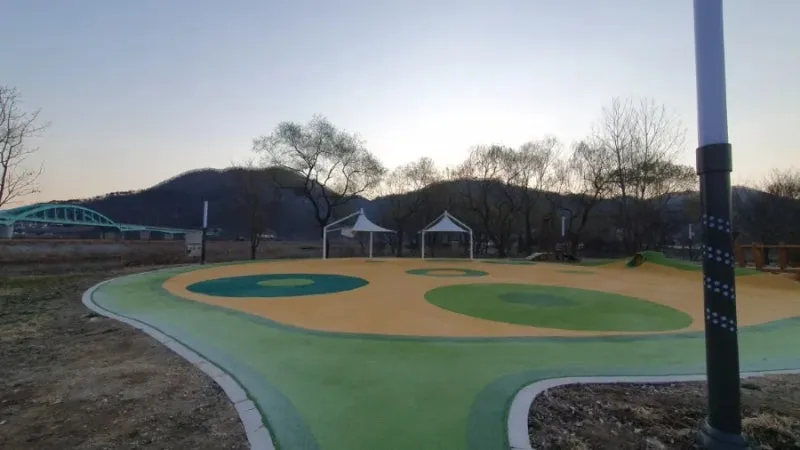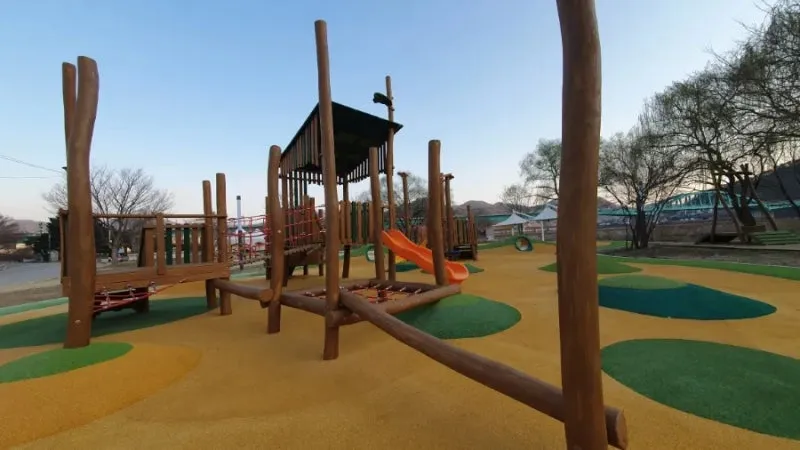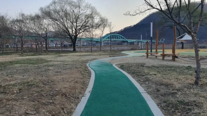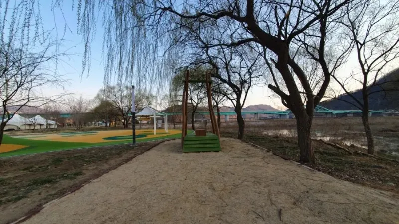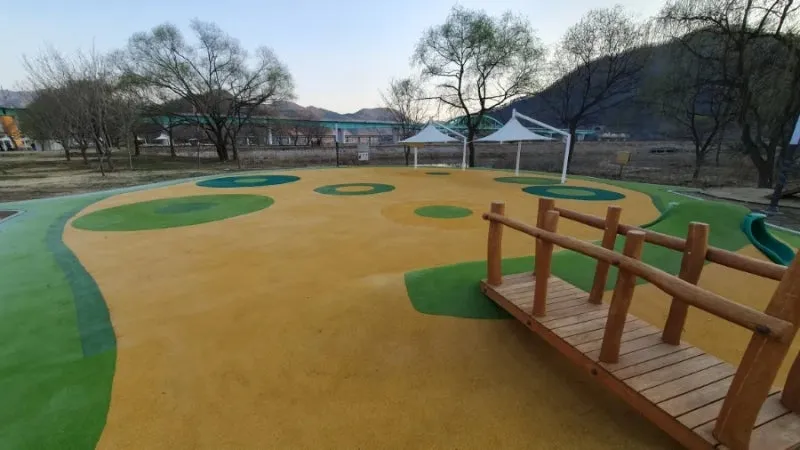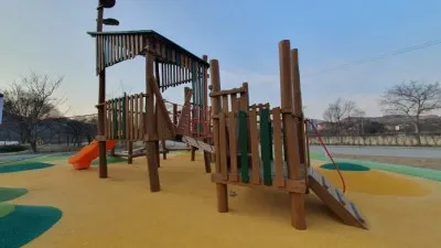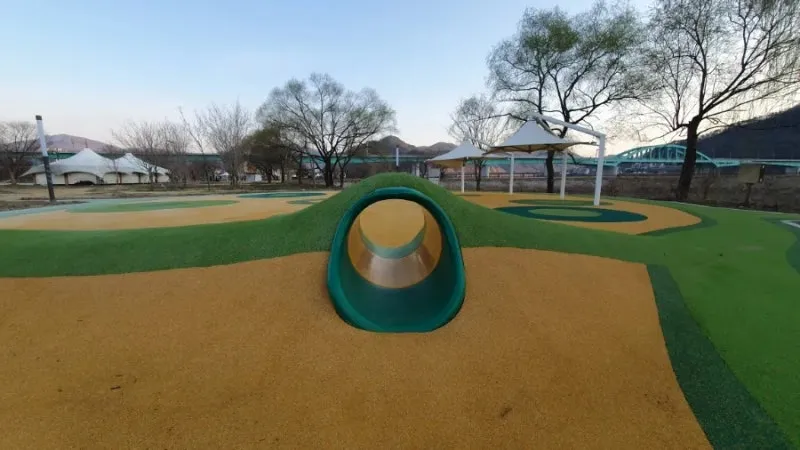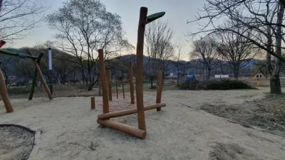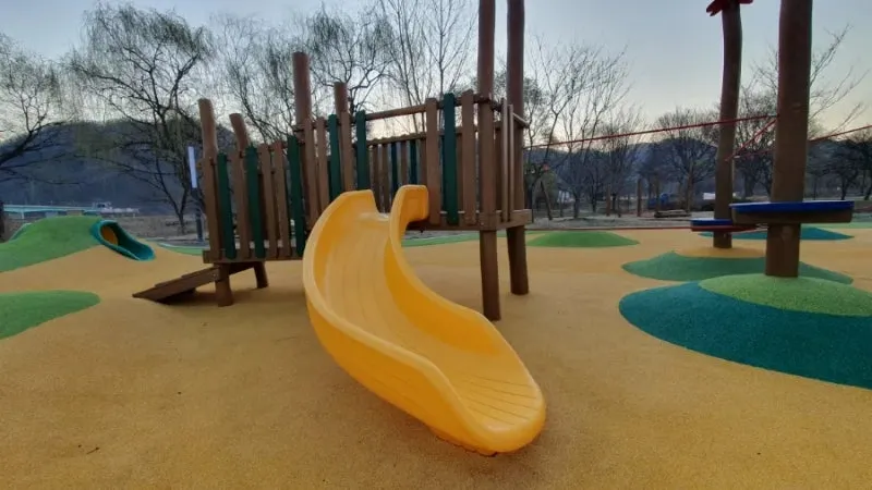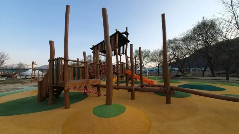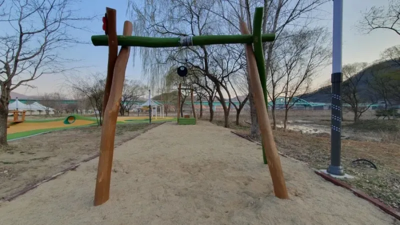 놀이터 한켠에는 아이들이 좋아하는 놀이기구 중 하나인 짚라인 시설도 설치되어 있습니다(다만 이 짚라인은 아직 운영 준비중으로, 현재 시점에서는 이용이 불가능하며 추후 개장을 기다리고 있는 상태입니다.) 짚라인이 설치된 구간은 놀이터 전체 공간 중 유일하게 바닥이 모래로 시공된 공간인데요, 이후 정식 운영이 시작되면 아이들이 짚라인을 이용하는 것 외에도 모래놀이 공간으로 활용될 수 있을 것으로 보입니다. 따라서 아이가 모래놀이를 좋아한다면, 간단한 모래놀이 장난감을 함께 챙겨 오시는 것도 좋을 것 같습니다. 이외에도 놀이터 관련 부가정보를 간단히 정리해드리면, 주변에는 공용화장실과 자전거 대여소가 위치해 있고 놀이터 건너편으로는 넓은 잔디광장이 펼쳐져 있어 아이들과 함께 공놀이, 연날리기 등의 활동도 가능하다는 점 참고하시면 좋을 듯합니다. (마지막으로 놀이터 바로 옆은 가평 지역에서 보기 드문 겹벚꽃 명소로 알려진 구간이기도 하니, 봄철 방문 시 아이들과 함께 사진을 찍거나 산책을 즐기기에 더없이 좋은 장소가 될 것입니다.)