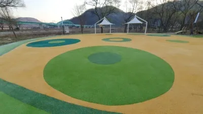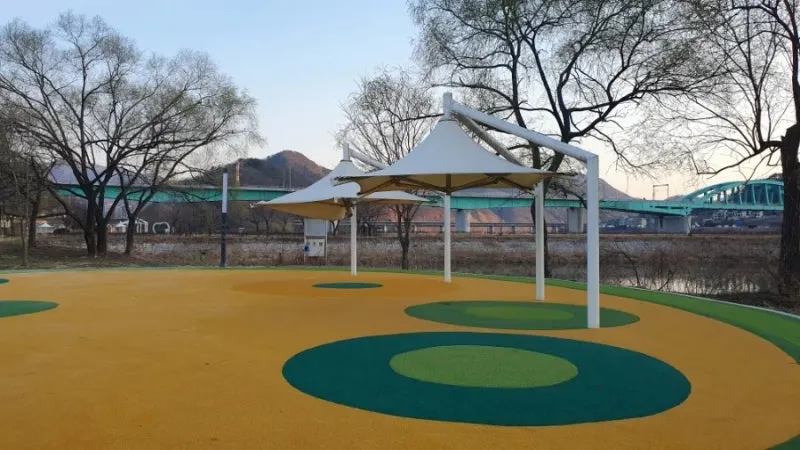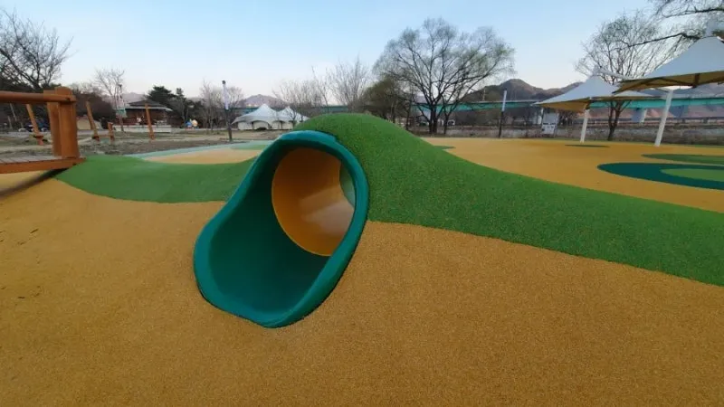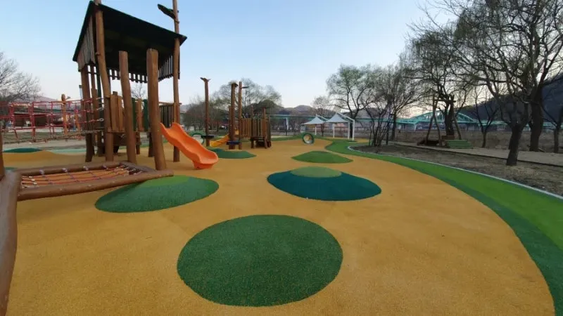 자라섬 어린이놀이터는 자라섬 서도 교차로 인근, 자전거 대여소 뒤편에 위치하고 있는데요. 기존에 자라섬을 방문하셨던 분들이라면 비교적 조용하고 한적했던 이 공간에 대규모 놀이터가 조성된 모습을 보며 반가움을 느끼실 수 있을 것 같습니다. 자라섬 어린이놀이터는 우리가 흔히 아파트 단지에서 볼 수 있는 소규모 놀이터와는 비교가 어려울 만큼 규모가 크고, 전체 시설이 알록달록한 색감으로 구성되어 있어 멀리서 보아도 이곳이 어린이를 위한 공간이라는 것을 한눈에 알아볼 수 있습니다. 직접 아이를 키우고 있는 입장에서 보면, 이런 야외 관광지에 잘 갖춰진 놀이터가 있다는 것은 부모들에게 정말 고마운 요소 중 하나입니다. 특히 자라섬 놀이터는 별도의 이용료 없이 무료로 개방되어 있으며, 모든 바닥은 아이들이 넘어졌을 때 다치지 않도록 충격 완화 우레탄 소재로 시공되어 있어 안전 측면에서도 신경을 많이 쓴 모습을 확인할 수 있습니다. 놀이터는 넓은 광장에서부터 시작되는데, 이 공간은 생각보다 넓어서 어린이집이나 유치원 등 단체가 방문하더라도 작은 운동회를 열 수 있을 정도의 여유가 있어 보입니다. 주변에는 보호자를 위한 벤치와 햇빛 가림막 등 편의시설도 함께 설치되어 있어 아이들이 노는 동안 부모들이 잠시 쉴 수 있는 환경도 잘 조성되어 있습니다.