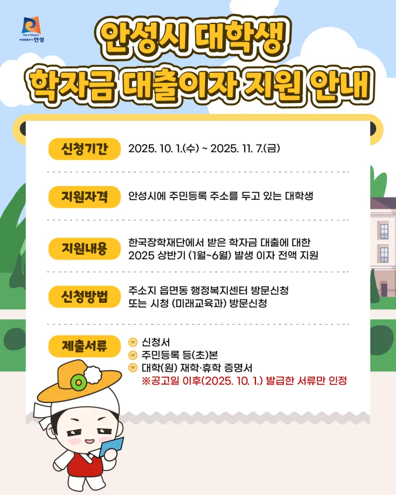2025년 하반기 안성시 대학생 학자금 대출이자 지원 안내
