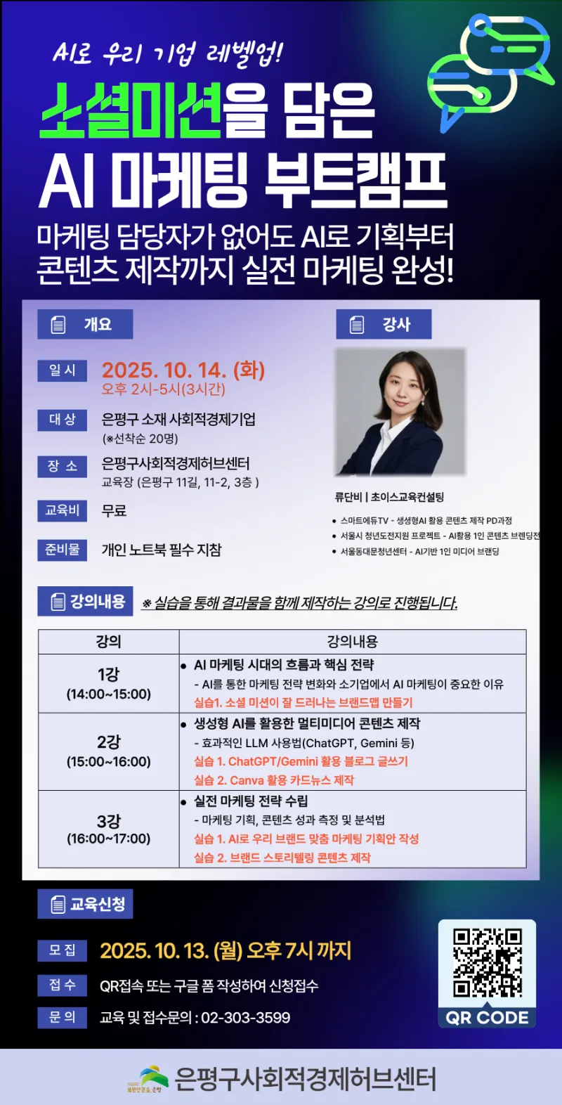 🌱 2025년 사회적경제 특강에 여러분을 초대합니다! "은평구에서 협동조합, 사회적기업, 마을기업을 운영하는 (예비)사회적 경제 기업 여러분을 위해, 각 시즌별, 이슈별, 그리고 긴급한 경영문제를 대응하기 위한 실전 특강을 준비했습니다. 혼자가 아닌, 함께 성장하는 따뜻한 배움의 자리에서 지속가능한 미래를 만들어가요! 여러분의 도전과 성장을 응원합니다. 지금 신청하세요! 💡✨" (사회적경제 특강) 소셜미션을 담은 AI 마케팅 부트캠프 : 마케팅 담당자가 없어도 AI로 기획부터 콘텐츠 제작까지 실전마케팅일 함께 배워보세요! 1) ...