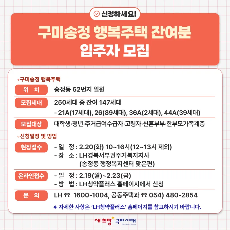 구미송정 행복주택 잔여분 입주자 모집 소식을 알려드립니다~! 🏡🏡🏡