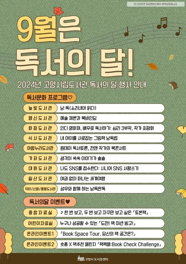 10월 26일은 일산호수공원 한울광장에서 2024 고양독서대전이 열립니다. 북마켓이 열리며 도서와 독서 관련 다양한 용품들 구경하러 오세요!