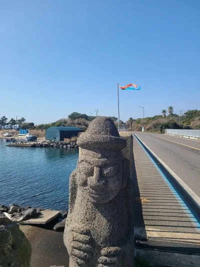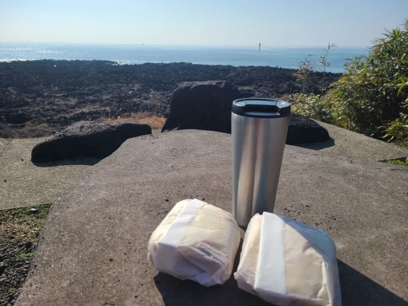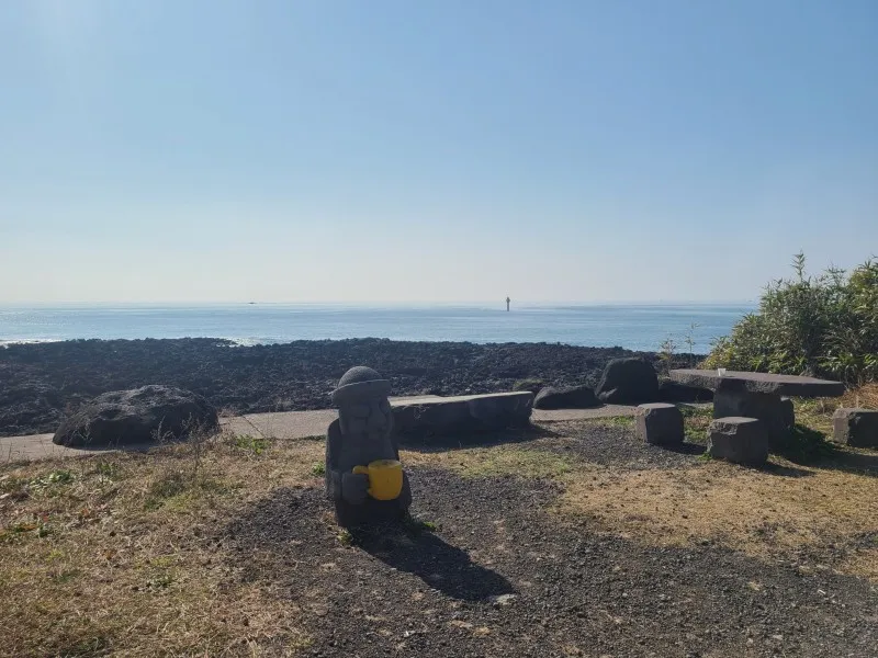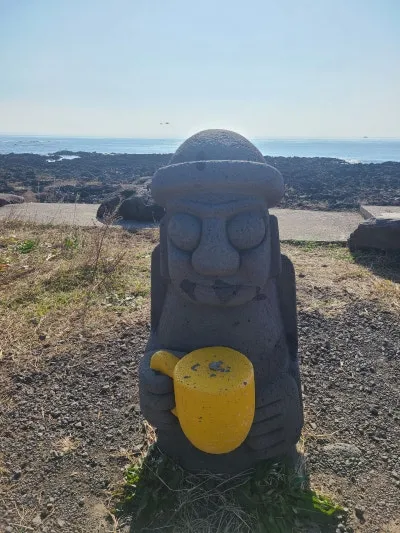 노란 컵을 쥐고 있는 돌하르방이 바당빌레(바당: 바다, 빌레 : 넓적하게 퍼진 암반)가 펼쳐진 바다를 등지고 서있어요. 바다를 바라보며 집에서 싸 온 샌드위치와 커피를 냠냠:)