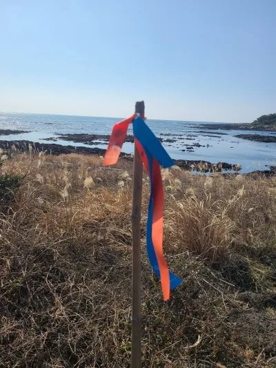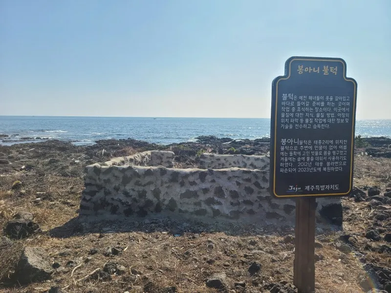 봉아니불턱은 태흥 2리에 위치한 불턱으로 주변에 민물이 없어 여름에는 돌확에 고인 빗물로 몸을 헹구었고 겨울에는 솥에 물을 데워서 사용하기도 했다고 합니다. 2012년 태풍 볼라벤으로 파손되어 2023년도에 복원된 모습이에요. 태풍으로 옛 불턱의 모습이 사라졌다니, 아쉬워요.