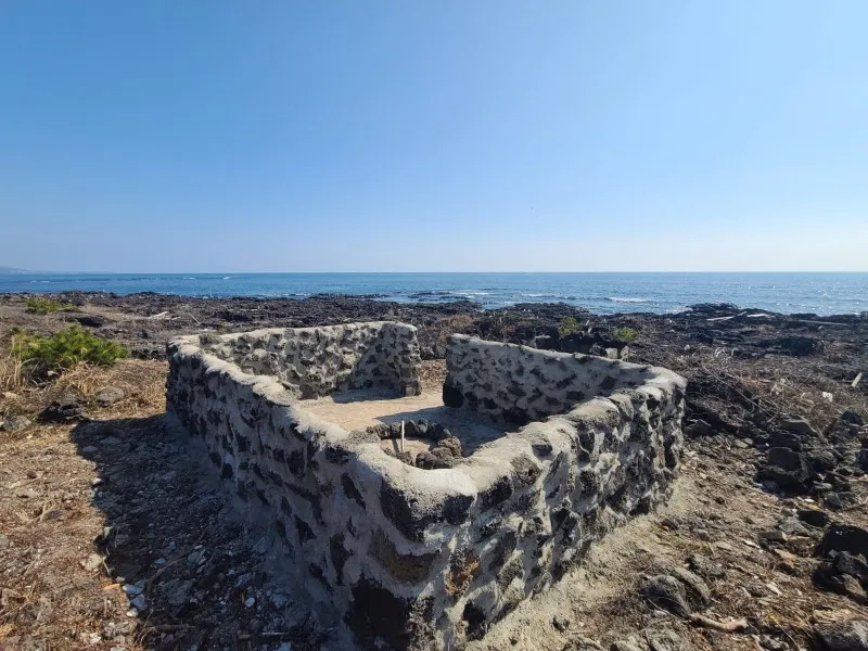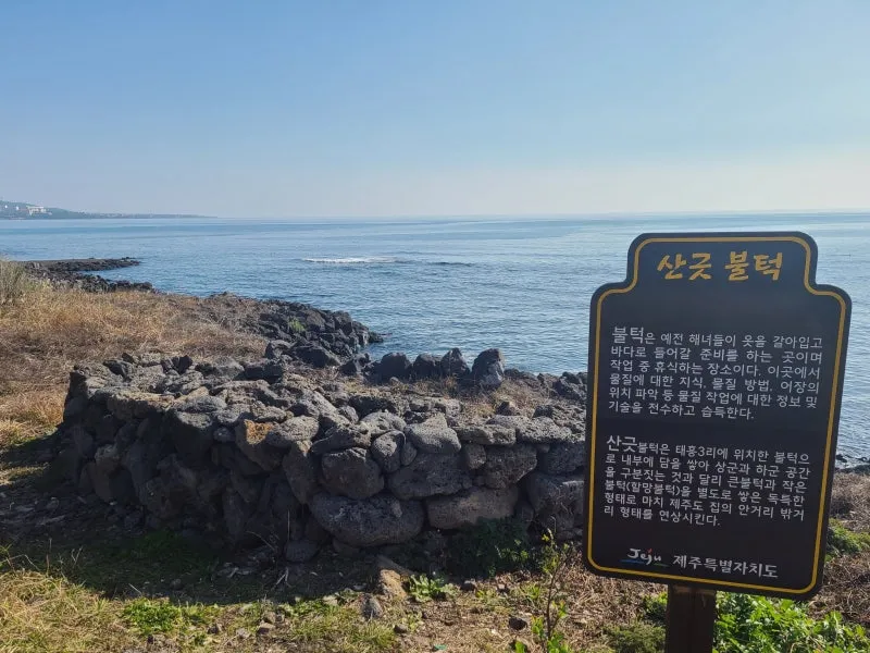 이름 그대로 '불'을 피우는 나지막한 '턱' 인 불턱은 예전 해녀들이 옷을 갈아입고 바다로 들어갈 준비를 하는 곳이며 작업 중 휴식을 취하는 장소에요. 이곳에서 물질에 대한 지식, 물질 방법, 어장의 위치 파악 등 물질 작업에 대한 정보 및 기술을 전수하고 습득했다고 하네요.