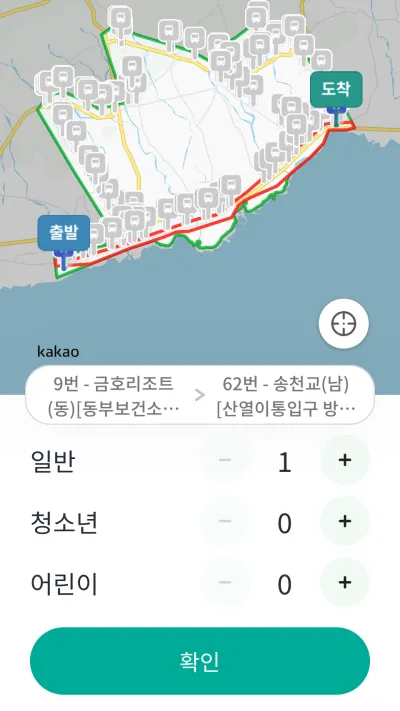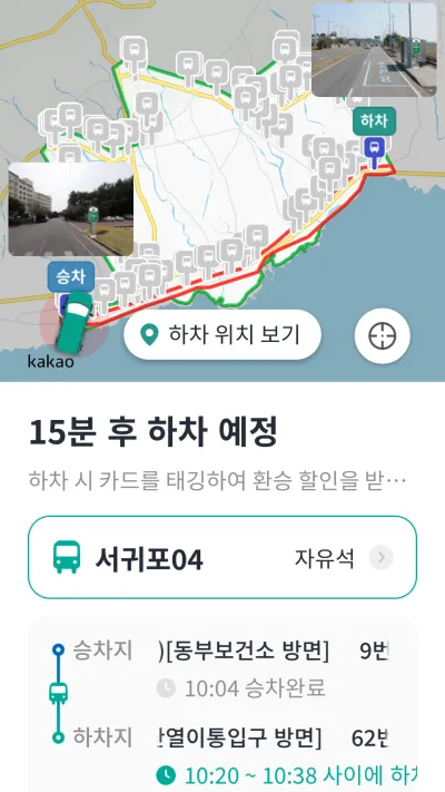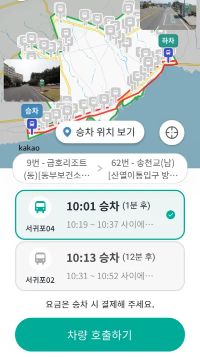 바로 DRT 앱을 통해 호출해 봤습니다. 기존 공영 정류장을 이용하고 있기 때문에 출발과 도착 정류장을 지도 내에서 선택해 줍니다. 승차인원을 설정하고 도착 가능한 차량 중 빠른 시간의 차량을 지정하고 차량 호출하기 버튼을 누르면 끝! 앱을 통해 승차와 하차 위치, 예상 도착시간 등을 자세하게 안내받았어요.