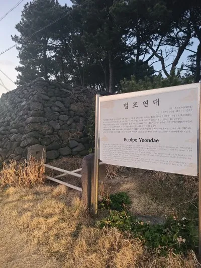 태흥 1리 쉼터 맞은편에는 벌포연대가 자리하고 있는데요. 연대(然臺)는 해안 구릉에 자리하여 적의 동태를 감시하고 옛날에 적이 침입하거나 위급한 일이 있을 때 낮에는 연기로 밤에는 횃불로 연락을 취했던 통신시설입니다. 정의현에 소속된 벌포연대에는 별장과 봉군이 교대로 지켰으며, 주변 연대와 교신했었고 1899년에 폐지되었다고 해요.