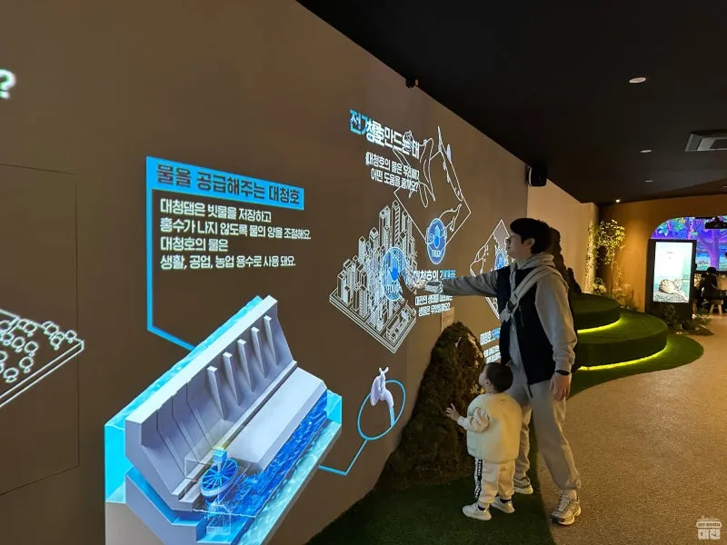 미디어를 터치하며 직접 대청호가 어떻게 만들어지고 그 물을 어떻게 활용하는지 보여주는 곳부터 체험을 해보았답니다. 눈으로만 보던 대청호의 실제 쓰임을 알게 되니 더 특별하고 소중하게 느껴지는 시간이었어요.