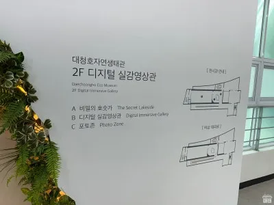 실내전시관 2층인 자연생태관을 먼저 가볼까요! 비밀의 호숫가, 디지털 실감 영상관, 포토존 이렇게 구성되어있는 곳이랍니다. 대청호를 산책하듯 사계절을 꾸며놓은 미디어아트를 즐길 수 있답니다.