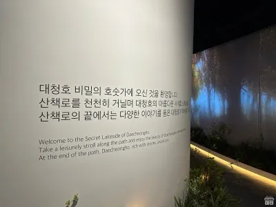 꽃피는 봄부터 시작하는 미디어아트가 너무 예뻐서 사진도 계속 찍게 되고 황홀하게 구경하게 만들더라고요. 대청호가 생기기 전 마을이 물에 잠기게 되며 대청호와 자연환경, 그리고 대청호에 서식하는 생물들이 미디어아트로 나올 때는 소름이 끼칠 정도로 넘 멋있고 아름다웠답니다. 사진에 안 담기니 직접 눈으로 꼭 보시기를 추천해요.
