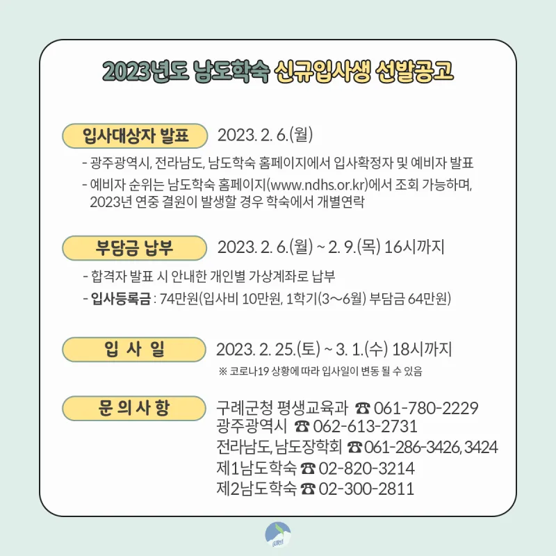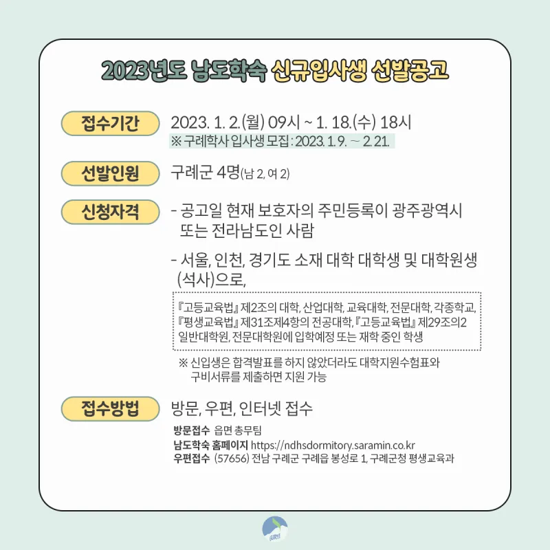2023년도 남도학숙 구례 신규입사생 모집합니다!