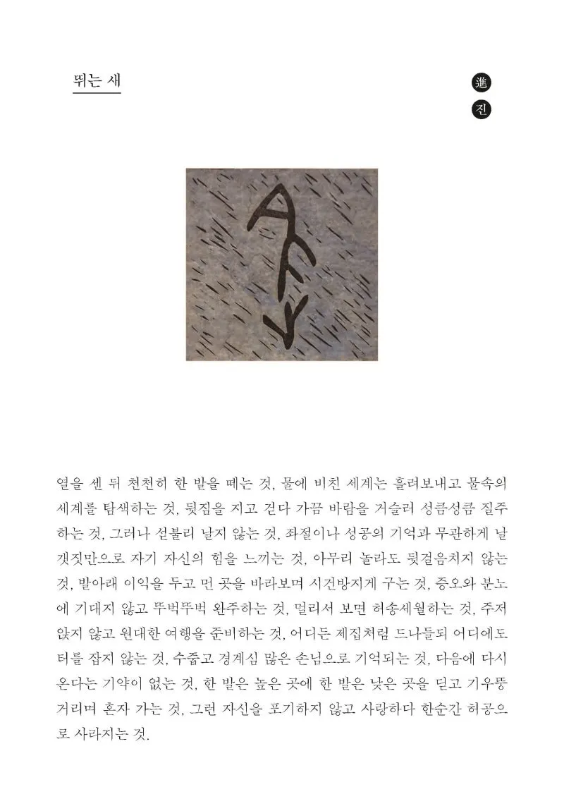 시장의 변화에 적응하기보다는 오히려 그 처음으로 되돌아간 것이다. 이번에 전시하는 작품들의 시적 모티브도 갑골문자다. 그에게 갑골문자는 “3천여 년 전의 옛말의 단어가 아니라 이 시대의 상징적인 문장이거나 이야기의 출발점”이다. 시인은 그 갑골문자를 목판에 새겨 세련된 색감의 판화로 만들었다. 이번에 선보이는 신작시들은 작은 에피소드와 같은 이야기로 구성됐다. 가족과 관련된 개인적인 이야기부터 우리가 잊고 있던 역사적인 사건까지 다양한 시점으로 소재와 시대를 초월해 아련한 공감을 불러일으킨다.