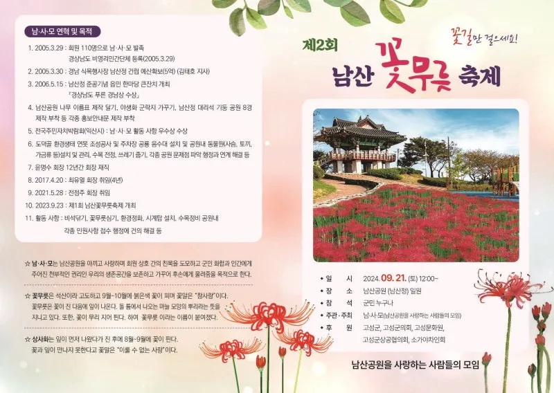 ✅내용 : 꽃무릇 노래자랑, 문화원 풍물단 열림마당, 맨발 둘레길 걷기 등