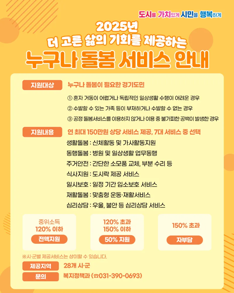 바쁜 일상 속에서 예상치 못한 상황이 찾아올 때 누군가의 도움이 간절하게 느껴지는 순간들이 있죠? 경기도에서는 시민분들의 어려움을 덜기 위해 누구나 돌봄 서비스를 운영하고 있는데요! 예기치 않은 상황 속에서도 시민여러분이 안심하고 일상생활을 이어갈 수 있도록 준비된 서비스 누구나 돌봄 서비스가 여러분의 일상을 조금 더 편안하게 만들어드릴 거에요! 필요한 순간 부담 없이 이용해보아요 q(≧▽≦q)