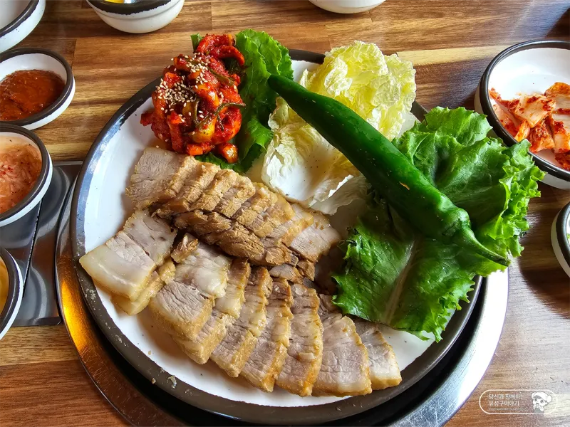 먼저 주문한 보쌈이 나왔습니다. 작은 사이즈로 주문했는데도 양이 꽤 많더라고요. 보쌈과 무말랭이무침, 김치와 쌈 야채까지 든든한 한 접시였습니다.