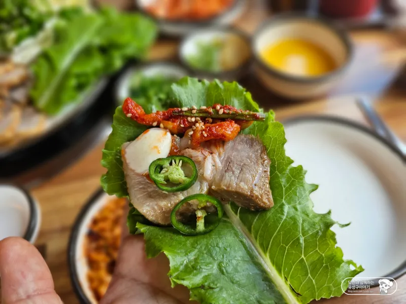 상추에 잘 삶아진 보쌈과 무말랭이, 야채를 모두 넣고 먹어봤는데요. 고기와 채소가 어우러져 맛의 조화가 좋았습니다.