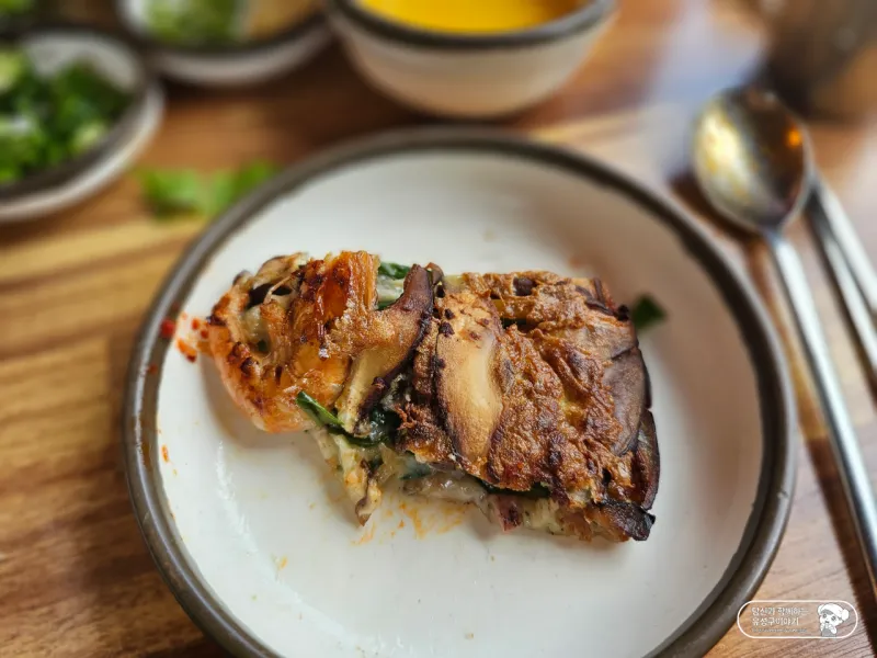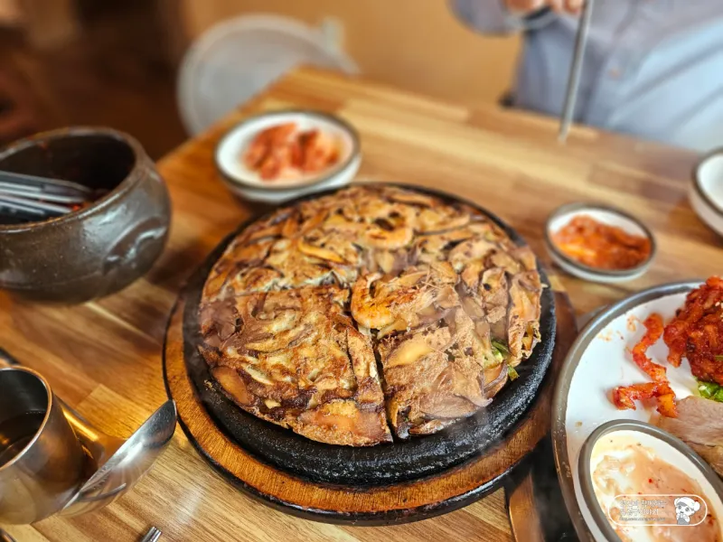다음은 파전입니다. 황토기와집의 파전은 꽤 독특한 비쥬얼입니다. 뜨거운 주물판에 담겨 나오는 파전은 파는 물론 새우와 오징어, 버섯까지 푸짐하게 들어있습니다.