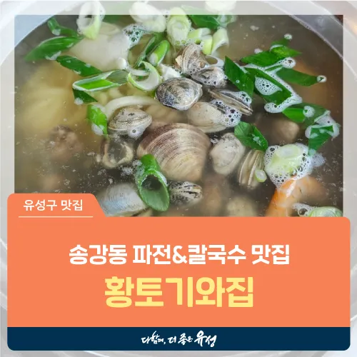 안녕하세요. 유성구 기자단입니다. 지난 장마 기간이 한동안 비가 많이 퍼부었죠. 비 오는 날 생각나는 음식이 있으신가요? 가장 먼저 떠오르는 음식 중 하나가 바로 전과 칼국수가 아닐까 싶습니다. 요번에는 유성구 송강동의 수타면 해물 칼국수와 버섯 해물파전으로 유명한 맛집을 소개해 보려고 합니다.