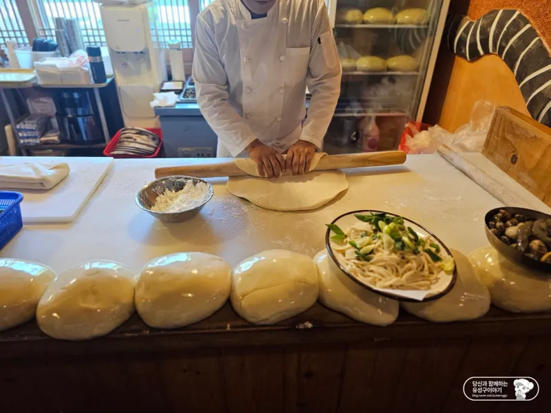 황토기와집의 칼국수는 모두 수타면인데요. 직접 칼국수 반죽을 하는 모습을 볼 수 있습니다.