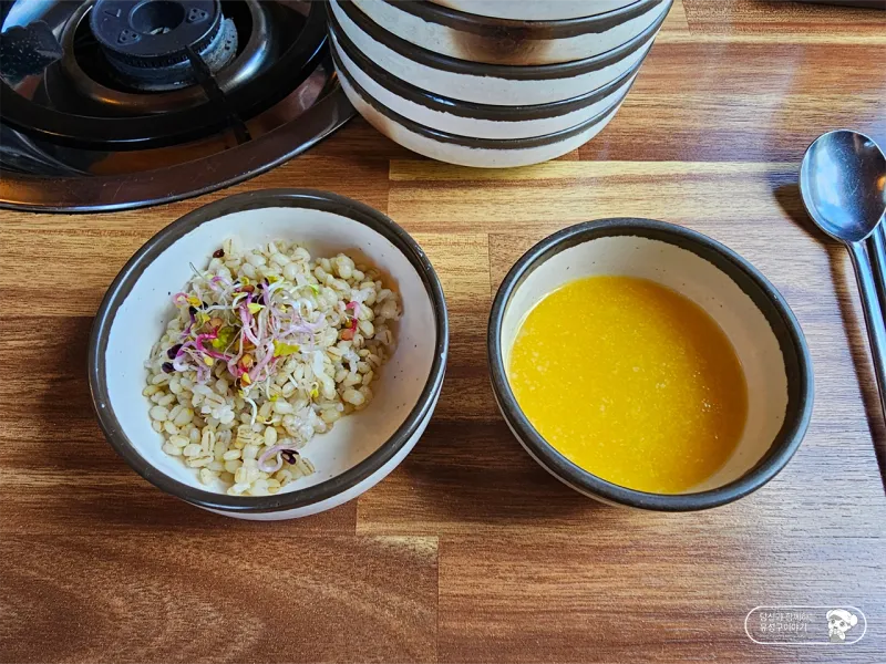 주문하면 기본으로 나오는 보리밥과 호박죽입니다.