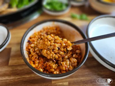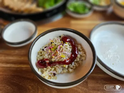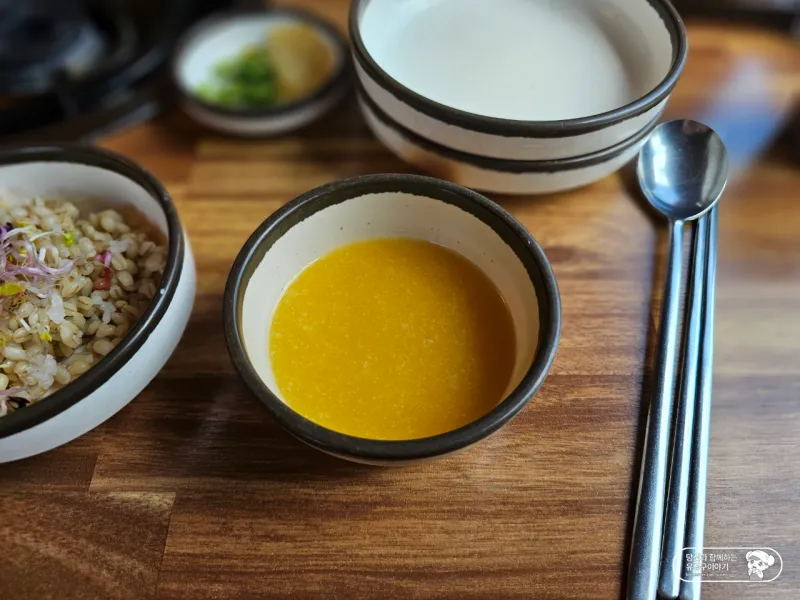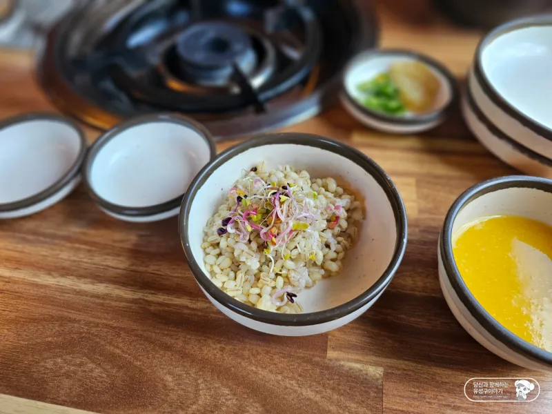 테이블마다 놓여있는 참기름과 고추장을 넣고 비벼 먼저 한 숟가락 떠봤습니다. 평소 보리밥을 먹을 일이 많지 않은데 이렇게 가볍게 맛보는 것도 좋았습니다.