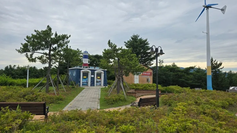 언덕 맨 위에 등대 모양으로 만들어 놓은 화장실이 있었어요.