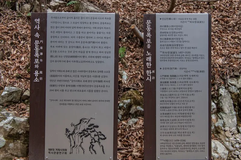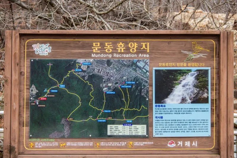 문동폭포로 가는 등산로를 따라가면 옥녀봉과 국사봉으로도 연결이 되기에, 등산을 좋아하시는 분들에게도 인기가 많은 코스 중 한 곳인데요. 문동폭포는 옥녀봉에서 흐르는 자연의 맑은 물이 20m 암벽에 쏟아지는 폭포수는 늪과 못을 이루고 물소리는 골짜기 안을 울리며 금강산의 구룡폭포와 같이 용이 등천하였다는 거제 유일의 폭포라고 소개되어 있네요.