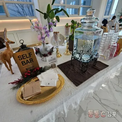 2층 구경하고 내려와서 이제 식사를 해볼까요? 스위티 1225 김포본점은 셀프바가 있어요. 물과 냅킨, 물티슈 등은 셀프바를 이용해야 되었어요.