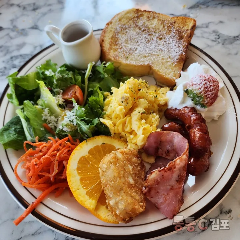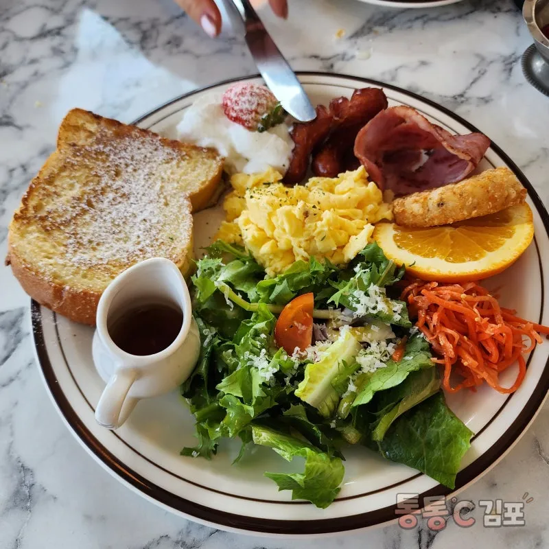 신선한 샐러드와 오믈렛, 당근라페, 해시브라운, 베이컨, 소시지, 달걀 토스트까지 먹고 싶은 것 다 올려져 있어요ㅋㅋㅋ.