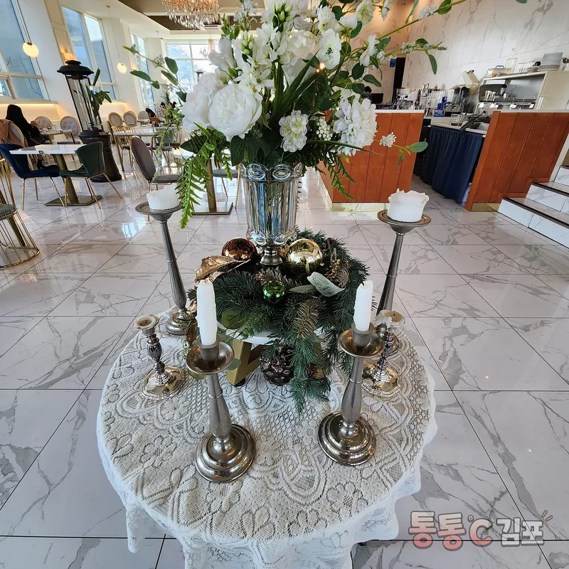 그래서 매일매일 이렇게 예쁜 초와 꽃과 트리 장식이 있었어요 ㅋㅋ. 좌석 간 배치도 넓고 천장이 높으니까 진짜 무슨 연회장에 온 듯한 느낌을 주더라고요!