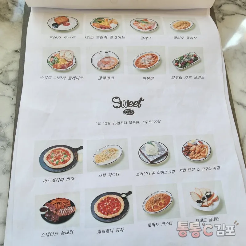 2층을 구경하기 전에 주문을 먼저 했어요. 스위트 1225 브런치 플레이트와 아메리카노 세트부터 피자, 파스타 등 다양한 메뉴가 있어요.