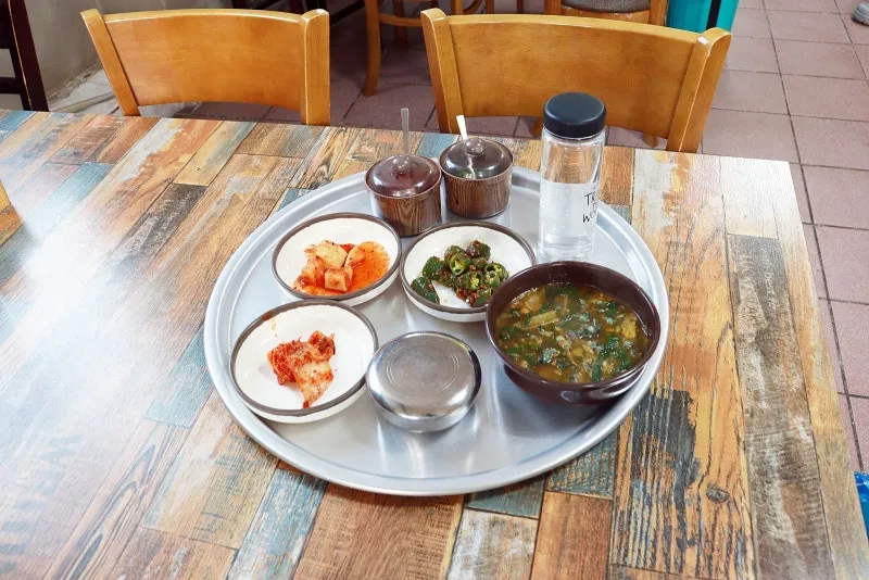 기본 찬은 깍두기, 김치, 고추를 된장에 묻혀서 내줍니다.