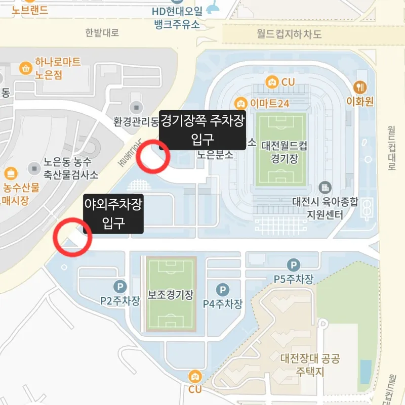 대전월드컵경기장은 크게 경기장 쪽 주차장과 야외 주차장으로 나누어 볼 수 있는데요. 두 개의 입구가 다르니 지도상 위치를 보시고 주차를 하려는 구역으로 들어가시면 됩니다.